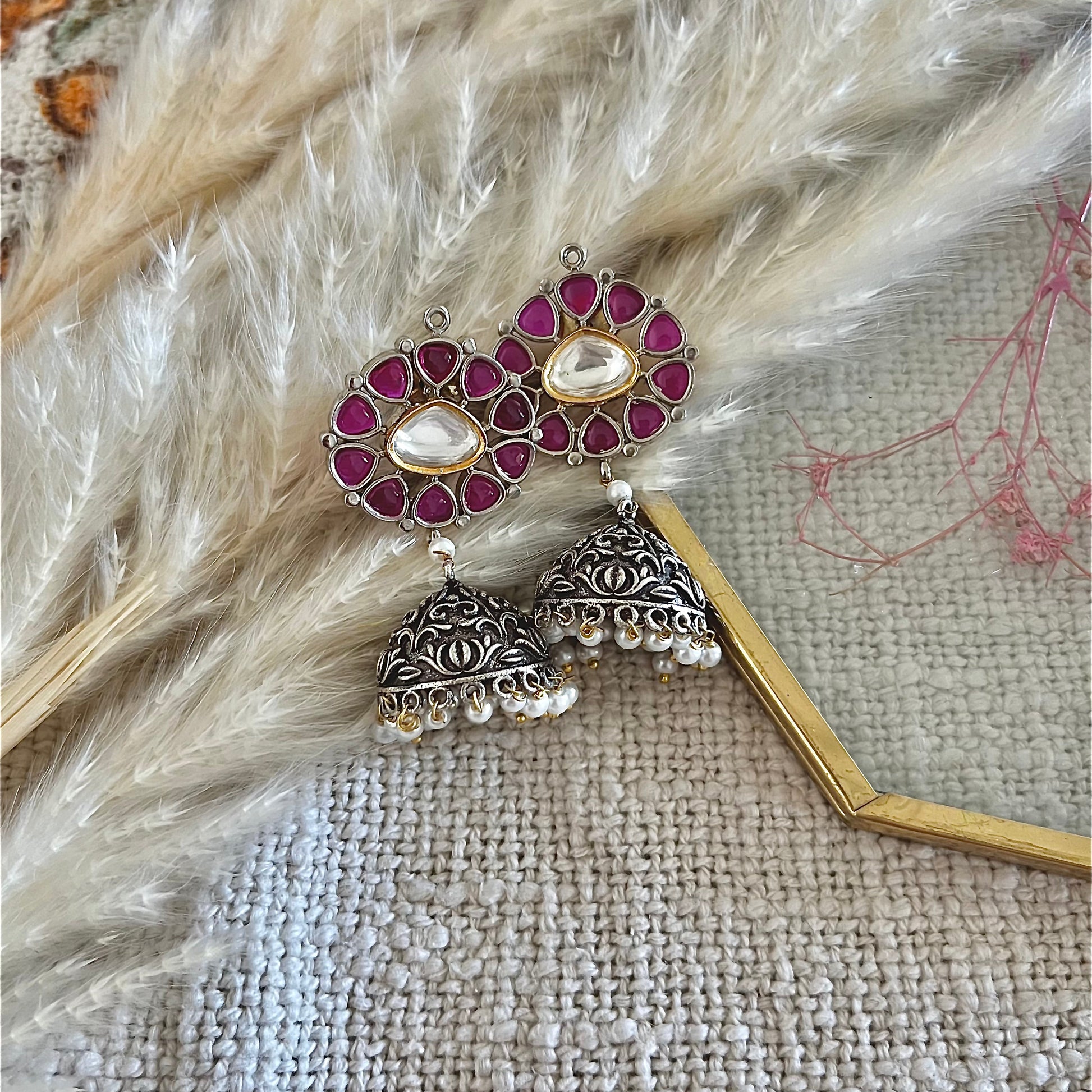 The Kehai handcrafted earrings feature a classic Jhumka style with ruby semi-precious stones and gold-plated German silver for a stunning look. A must-have for any jewelry collection, these earrings will add an understated elegance to any outfit.
