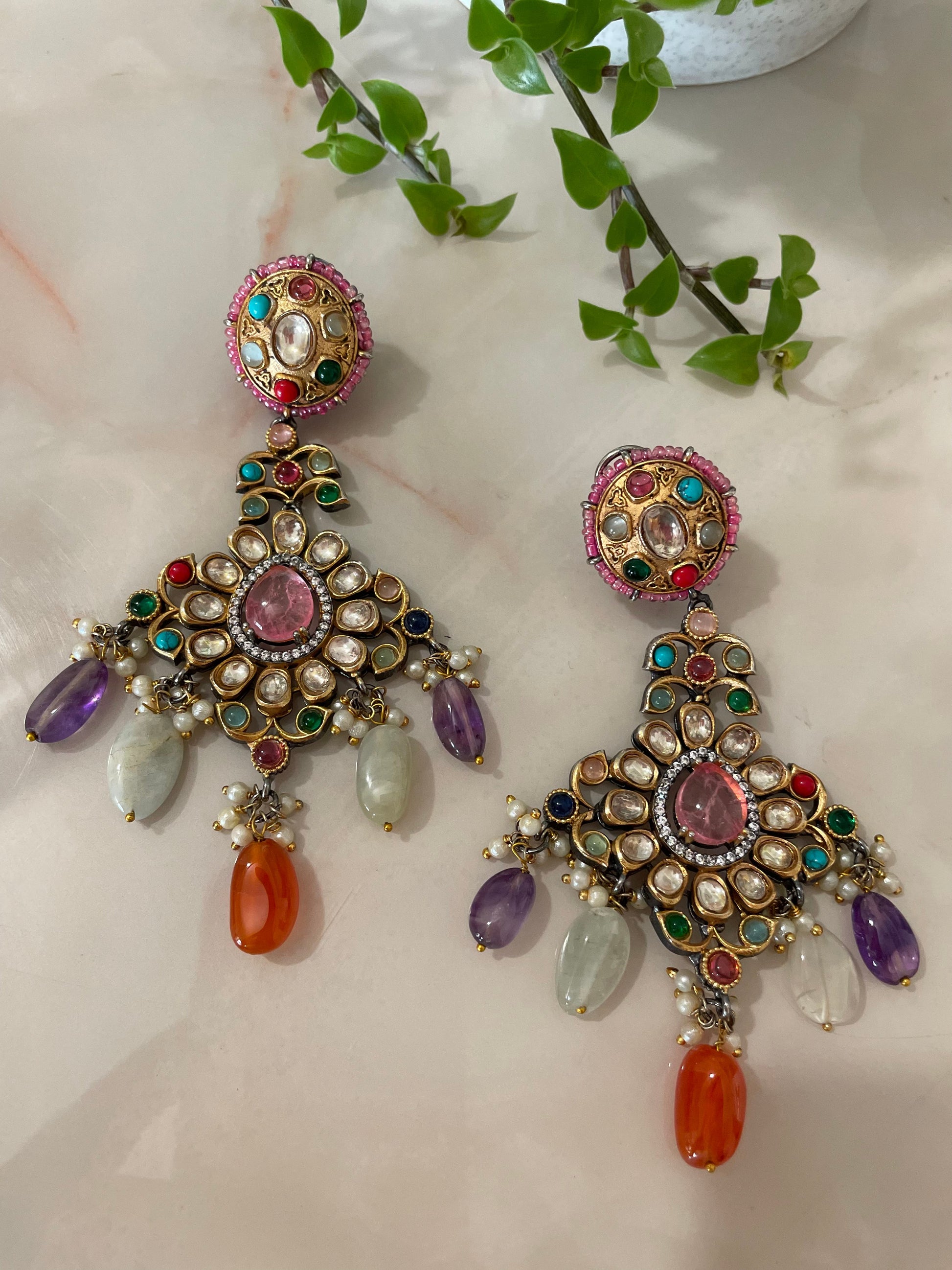 Multi-coloured Kundan earrings with semi precious stones