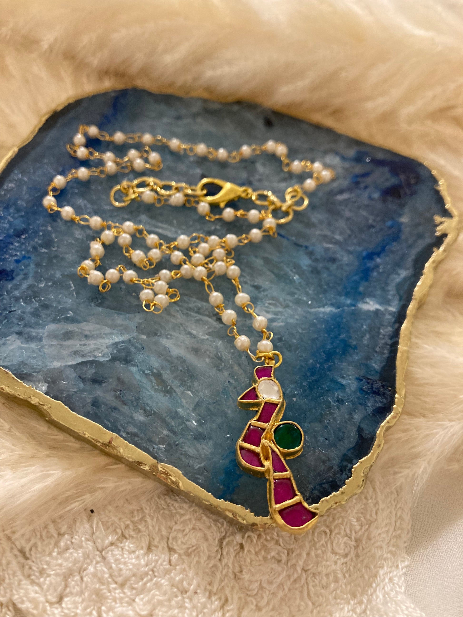 Pachi Kundan peacock pendant with pearl string in silver and alloy