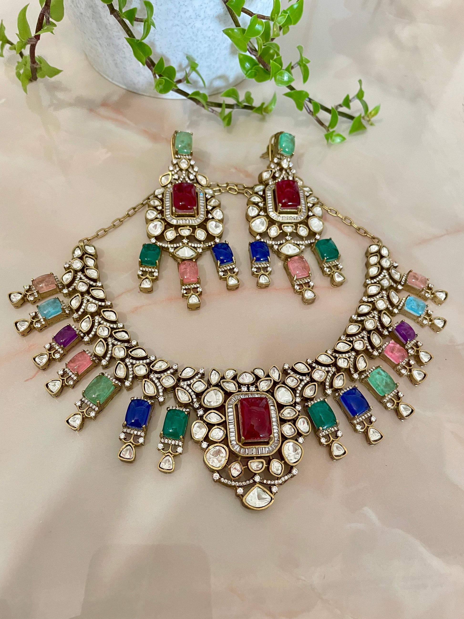 Elevate your ensemble with this luxurious necklace set, featuring a harmonious blend of richly colored gemstones encased in gleaming two-tone settings, accented by radiant crystals. The set includes a statement necklace with a cascading design and matching earrings that epitomize elegance. Perfect for special occasions, this set promises to add a regal touch to any outfit.