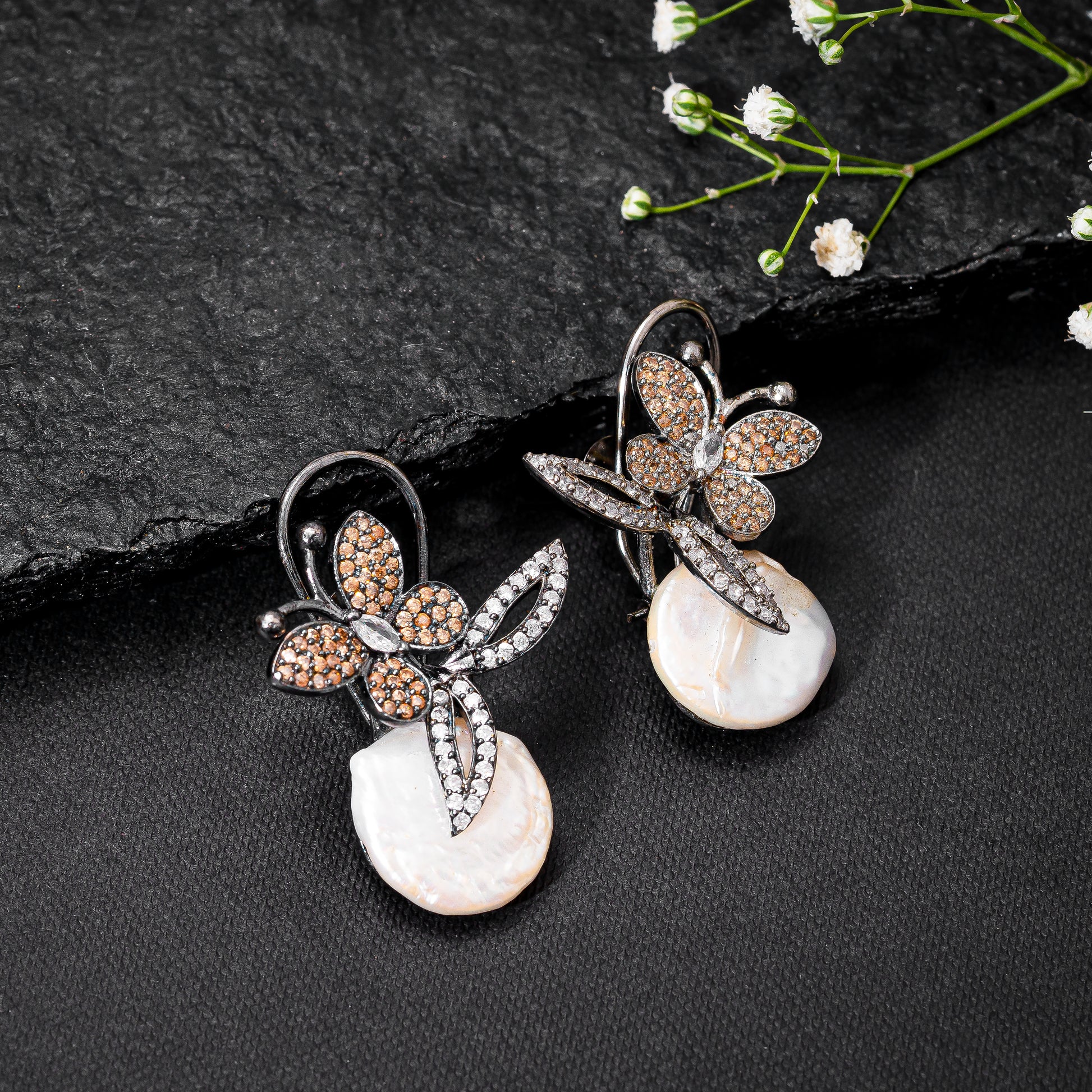 The Arah earrings feature a beautiful floralbutterfly embellished with diamonds and baroque pearl.