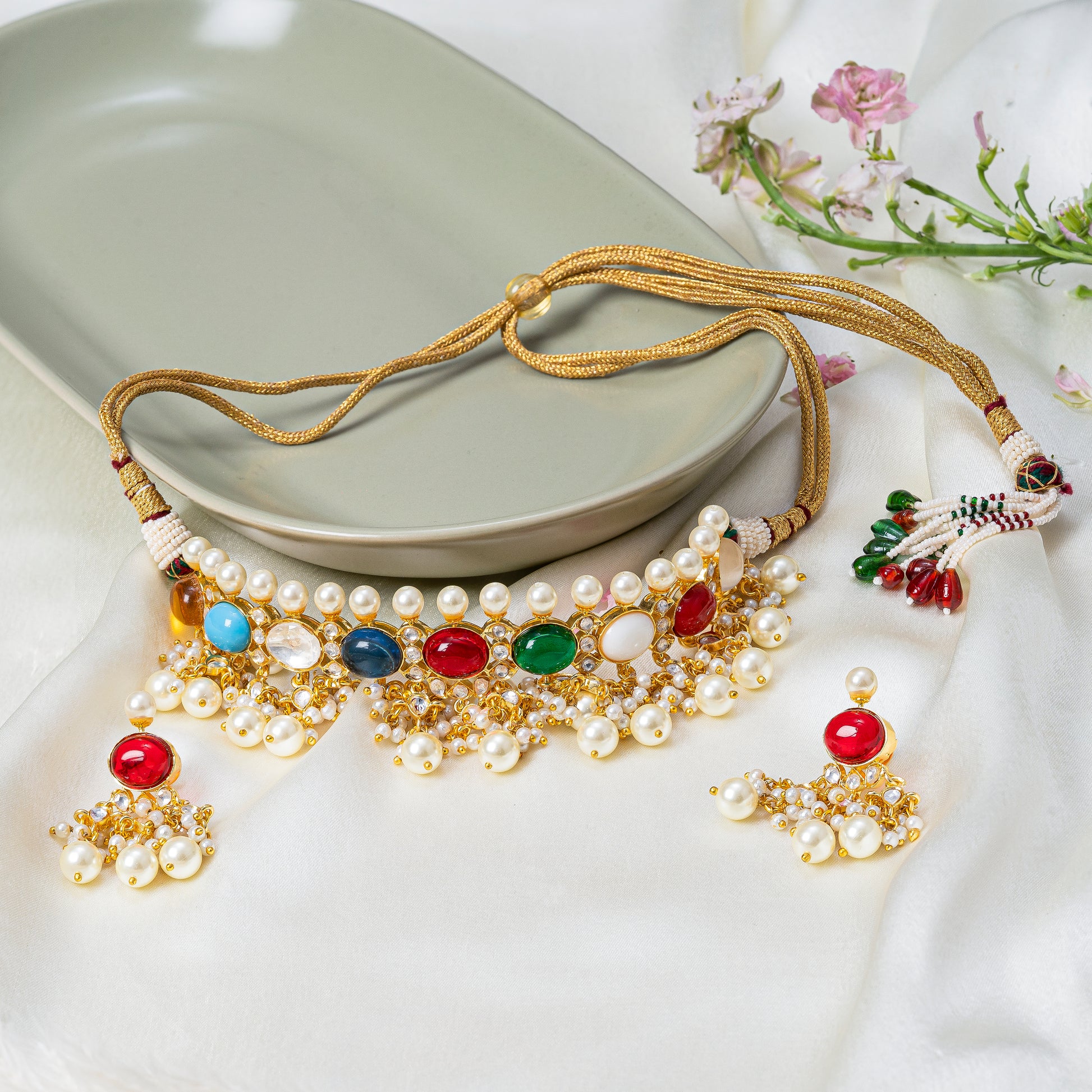 Our Naangai necklace set is symphony of nine navrattan colors, each one bringing its own mood to your collarbone.The necklace also has matching earrings which complete its regal look. This set with its elements dipped in culture, weaves innumerable tales about India's history, traditions and art and is a delight for a jewelry connoisseur.