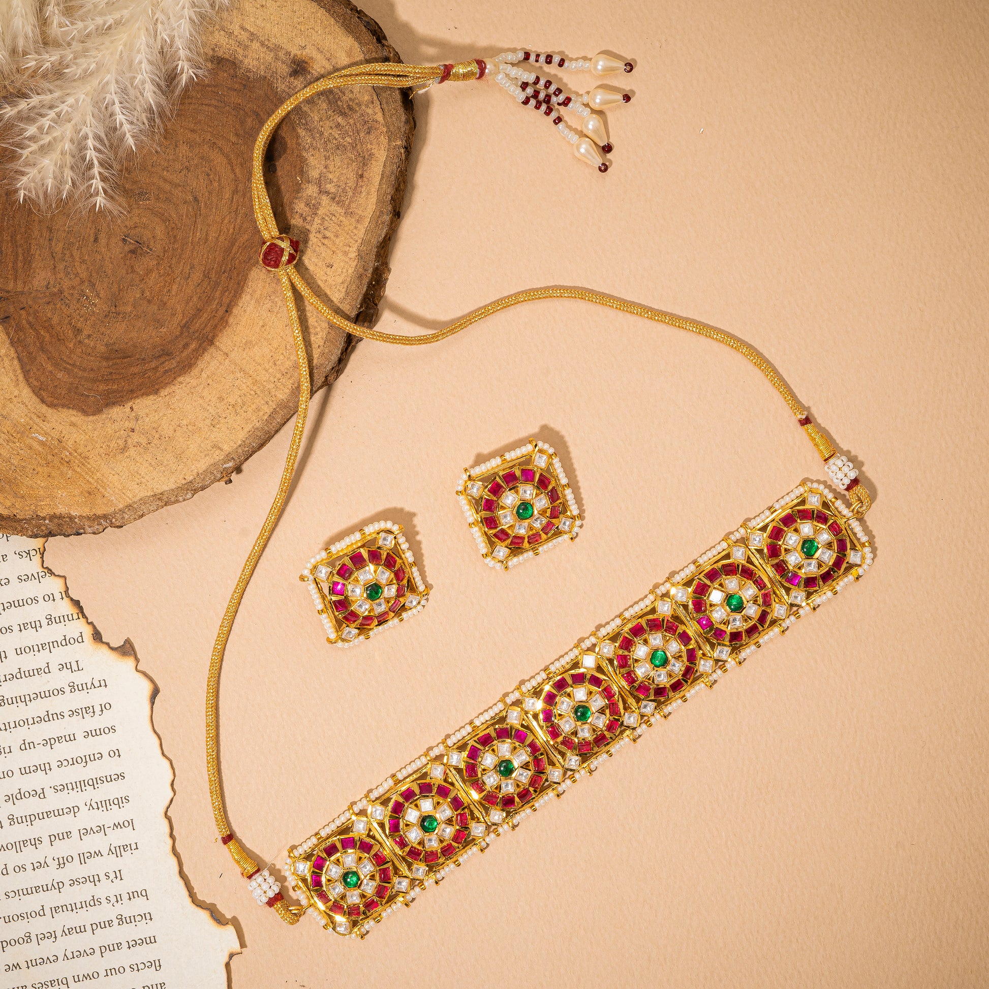 The Manya Choker set featuresan opulent floral design, this is a splendid necklace set to deck up your neck with a certain regal charm.