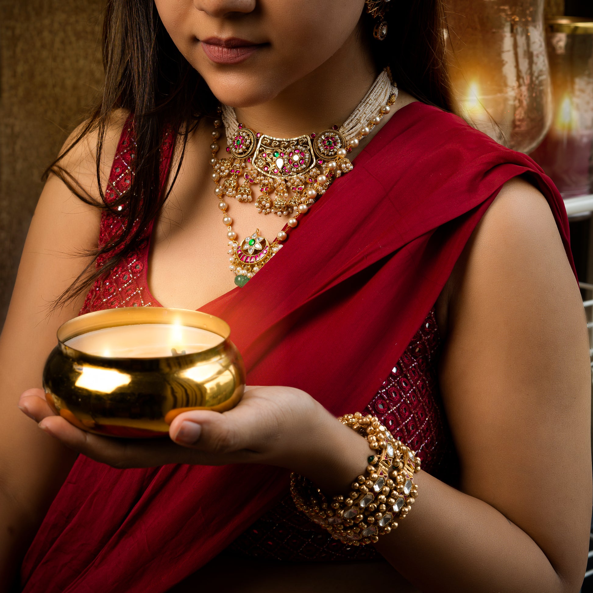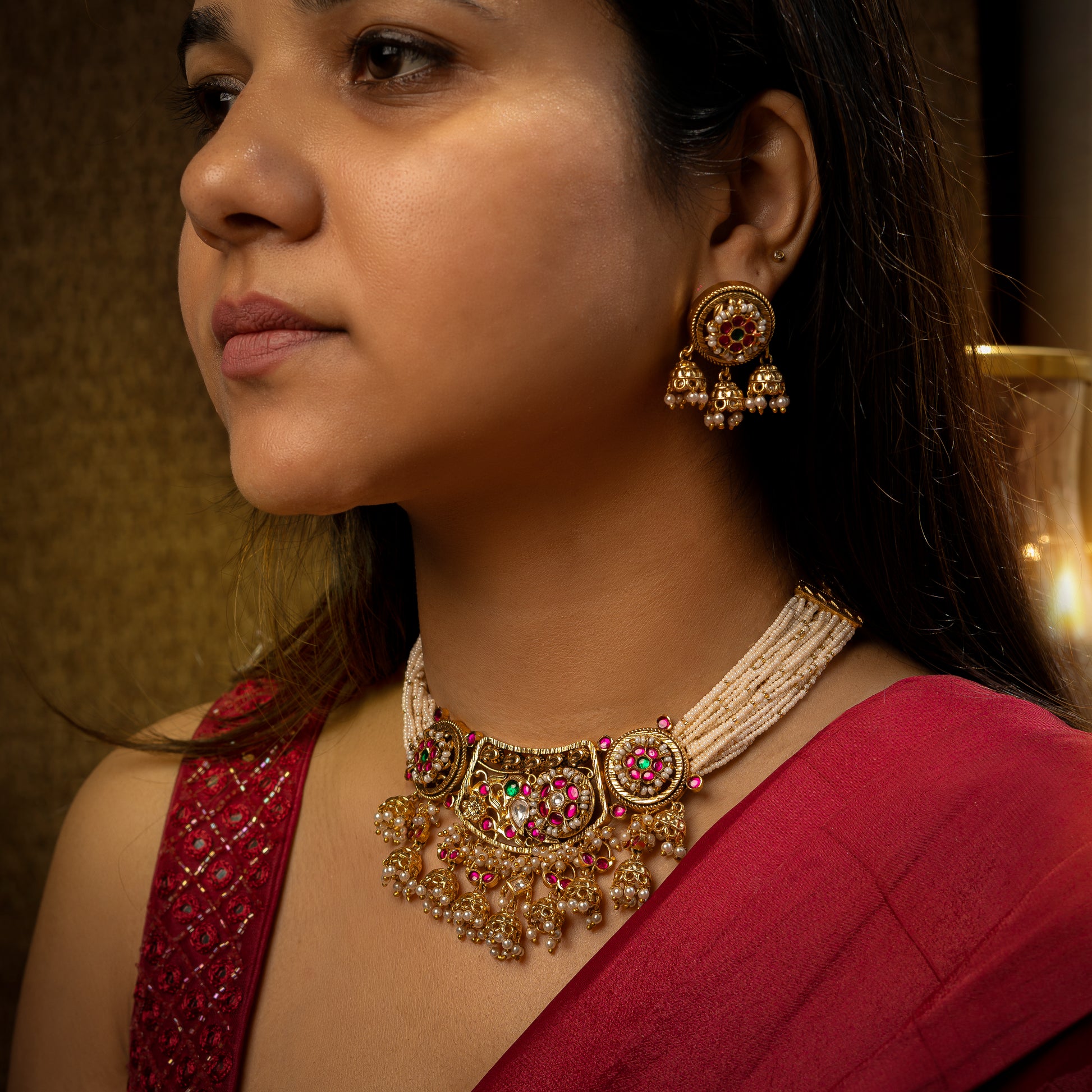 The Zansi necklace set features intricately detailed work inspired by the temple jewelry of South India. The monotony of the geru gold is broken by the added richness of green and pink kundan stones.